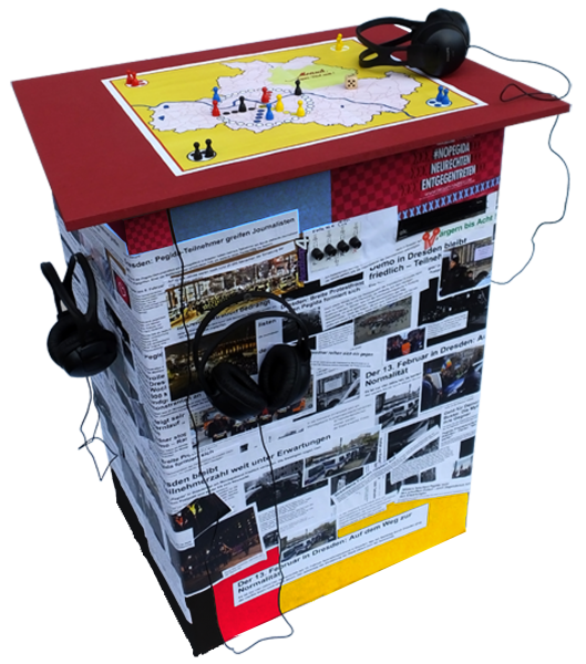 …mitspielen. Da wäre zum Beispiel die Installation von echofreak , betitelt mit „ärgern, bis 8“, welche zur Zeit noch in der Berliner Galerie Vinogradov zu sehen ist. Oder die in den „Regentropfen vervielfältigte Meißner Burg von Jessi Haa. Mit dabei sind diesmal: